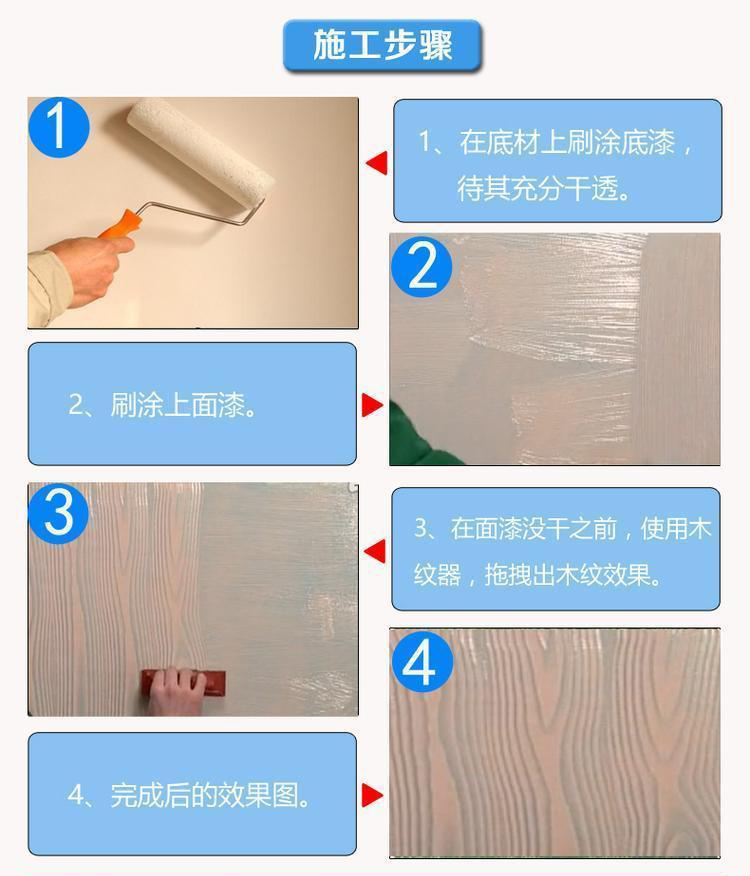 4、可呈現(xiàn)各種木紋狀藝術(shù)圖案,圖案隨意、細(xì)膩、無接縫、不起皮、不開裂,底色和面色可以自由搭配,圖案可任意創(chuàng)作。古色古香,壽命長(zhǎng);